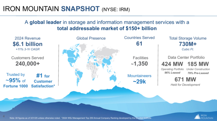 Iron Mountain is a storage and information management REIT. Its services include record management, destruction, fulfillment services, data protection and recovery, server and computer backup services, and safeguarding of electronic and physical media.
