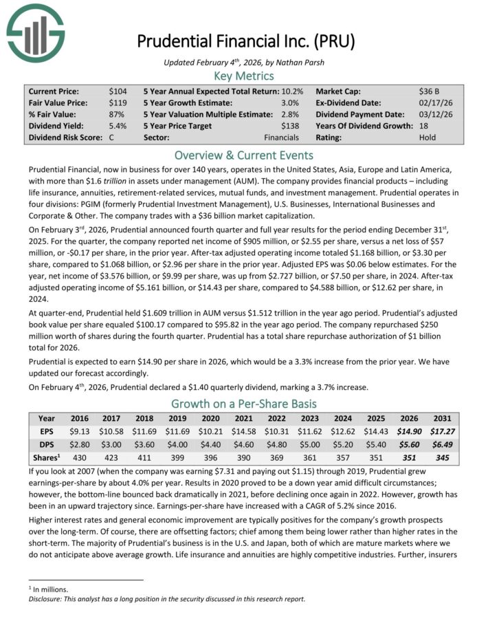For the year, net income of $3.576 billion, or $9.99 per share, was up from $2.727 billion, or $7.50 per share, in 2024. Prudential is expected to earn $14.90 per share in 2026, which would be a 3.3% increase from the prior year.