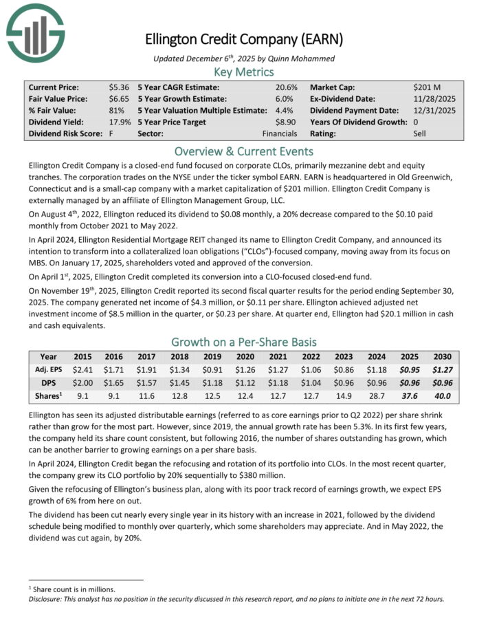 - Undervalued High Dividend Stock #4: Ellington Credit Co. (EARN)