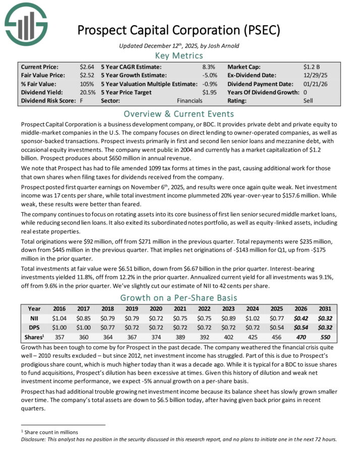 Prospect posted first quarter earnings on November 6th, 2025. Net investment income was 17 cents per share, while total investment income plummeted 20% year-over-year to $157.6 million. While weak, these results were better than feared.