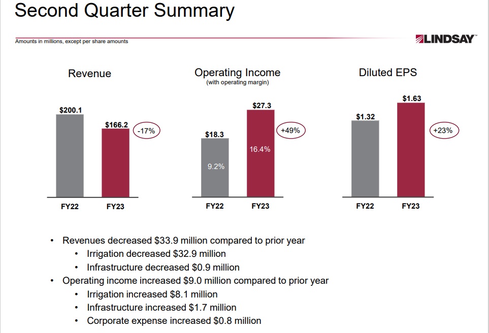 On June 26th, 2025, Lindsay reported its Q3 2025 results for the period ending May 31st, 2025. The business saw diluted earnings-per-share of $1.78 which fell slightly from the $1.85 reported the same quarter of last year.